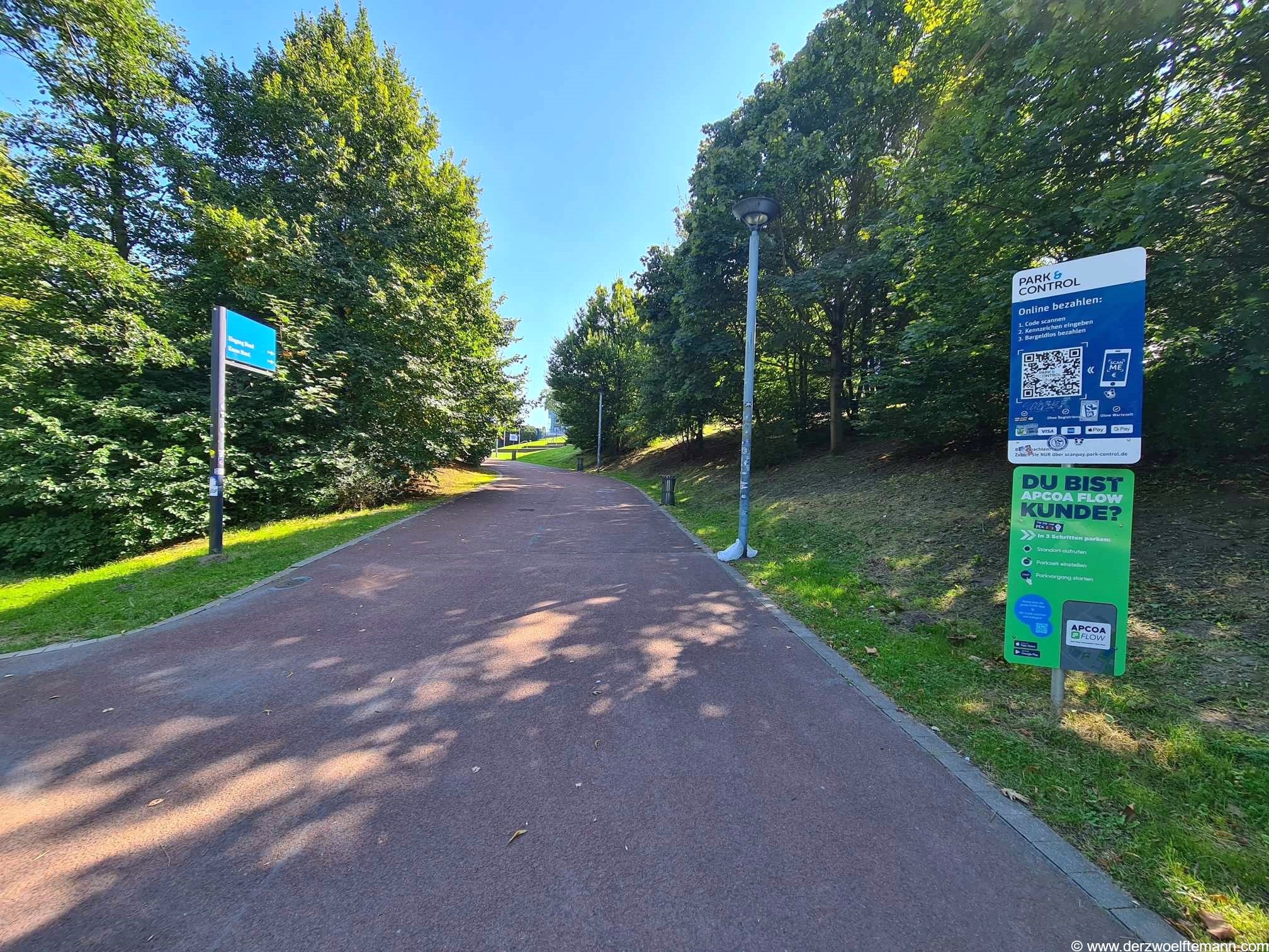Die Gästeparkplätze für PKW und Busse werden über den Berni-Klodt-Weg angefahren. PKW fahren nach rechts auf den Parkplatz E2. Busse mit Gästefans biegen am Berni-Klodt-Weg nach links auf den Parkplatz Gelsenwasser ab.